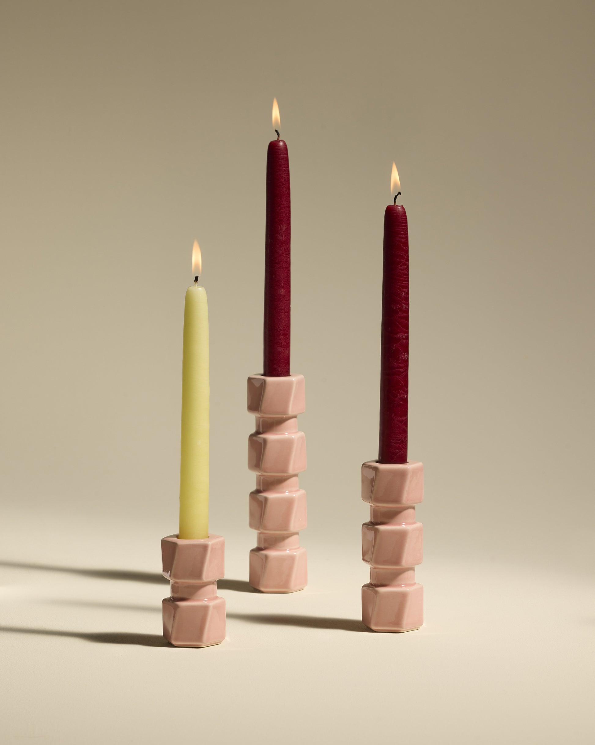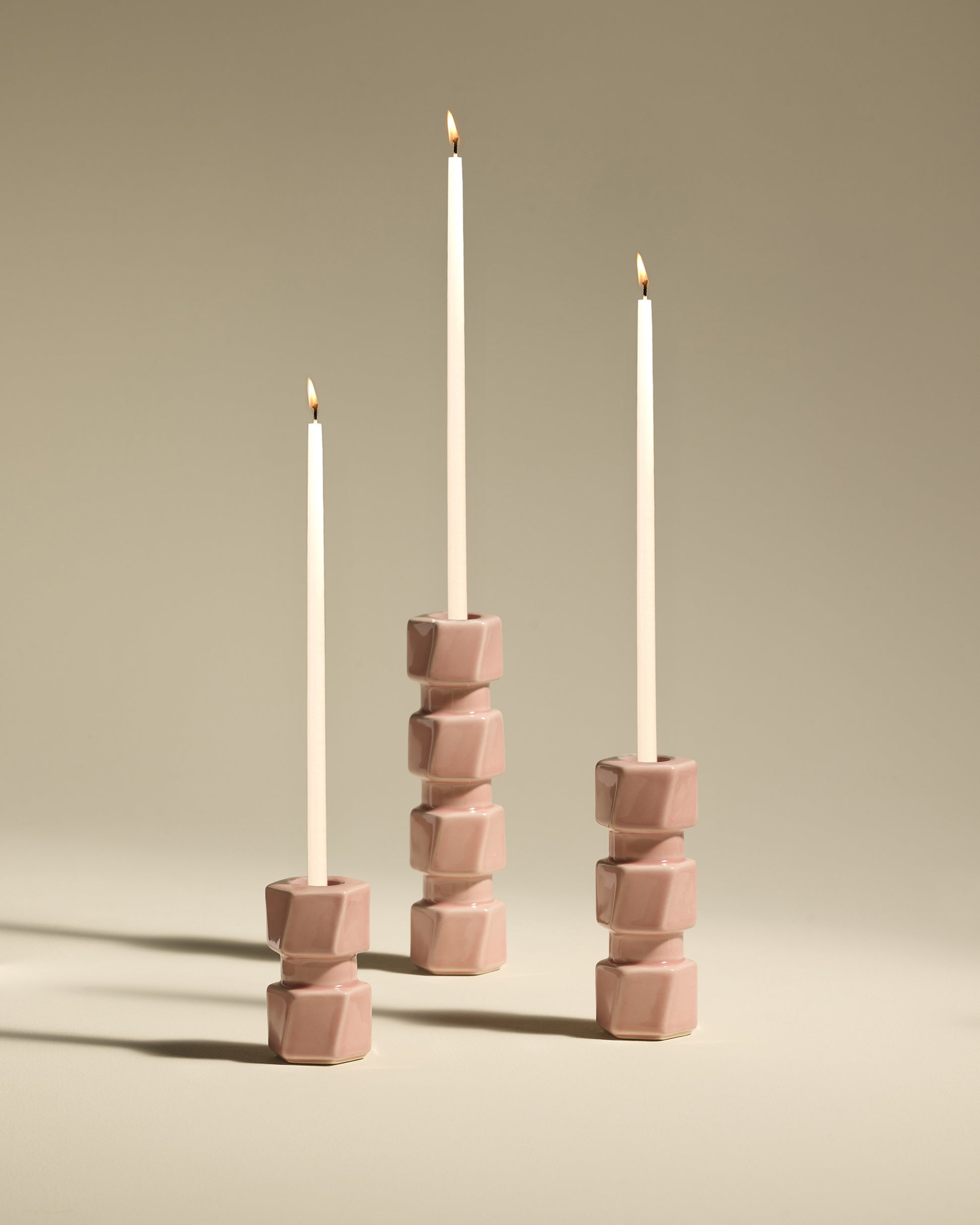 Featuring three different heights, entirely made of glazed ceramic, they house a double interior notch that allows them to support both thin candles and traditional candles.