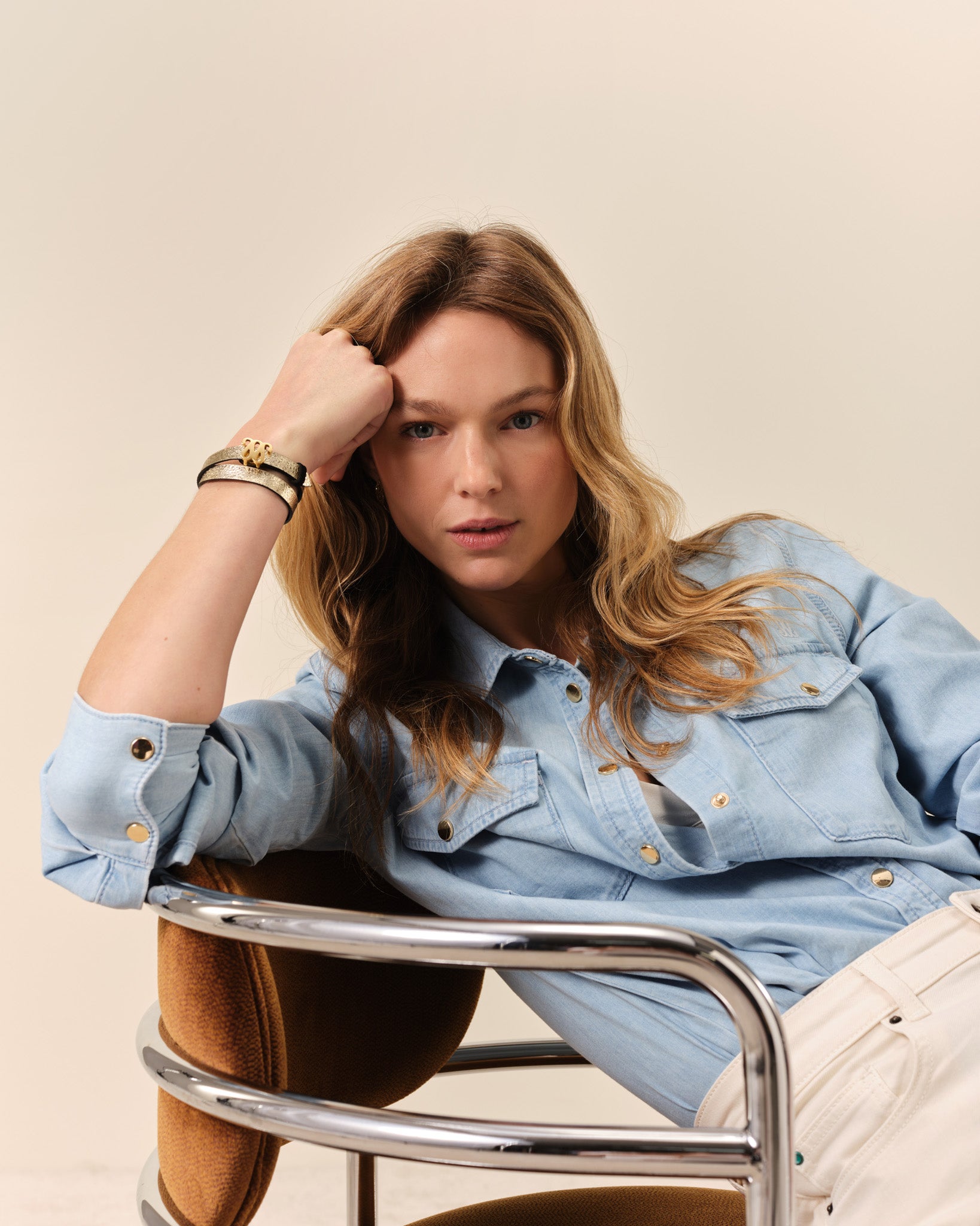 Its clasp, adorned with the Maison Sarah Lavoine monogram, adds a graphic detail to the wrist, while its double-wrap length elegantly envelops it.