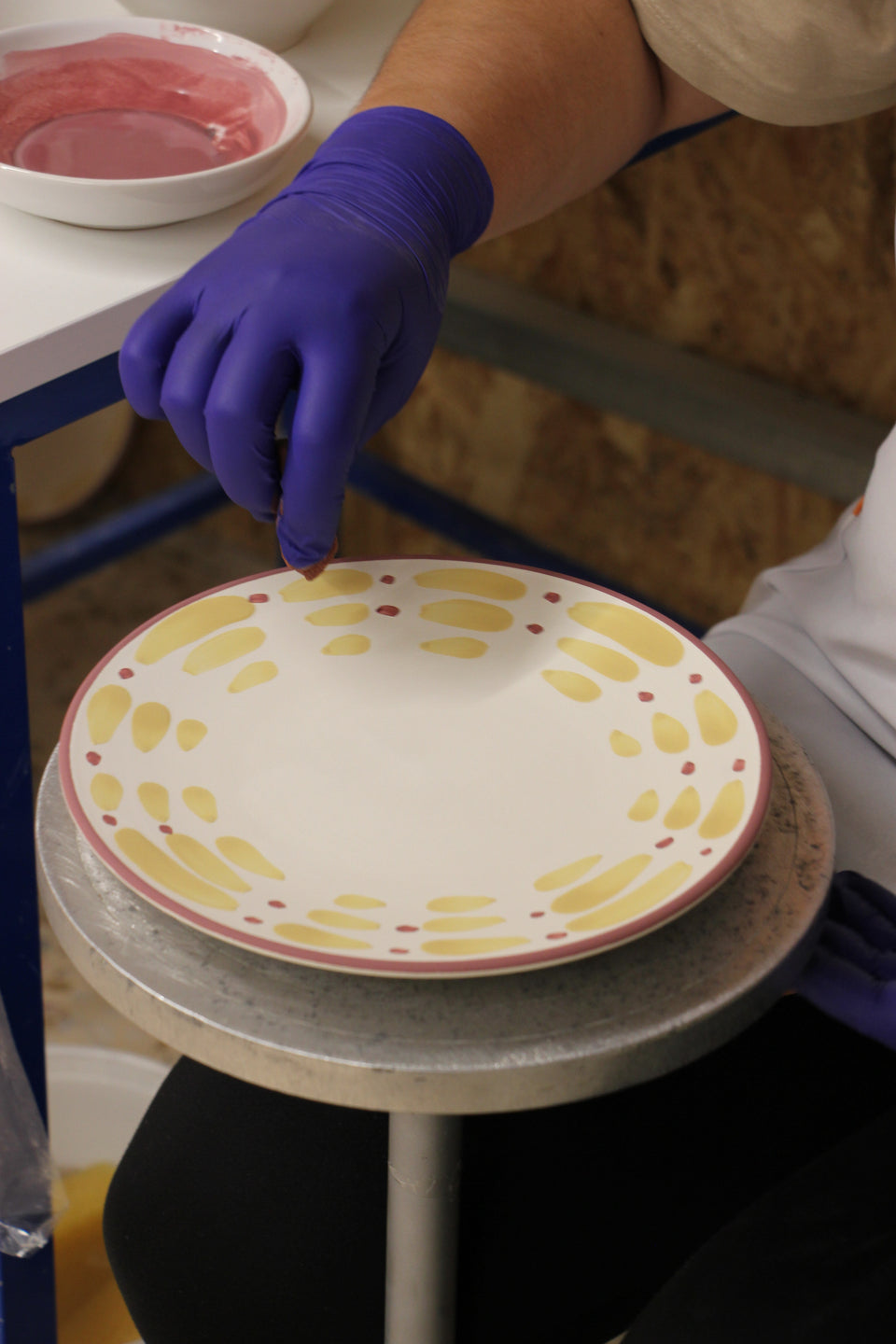 This piece was shaped using the engobe technique – a coating with an earthy finish – for the matte appearance of the ceramic foot and its cap is adorned with a tone-on-tone braid and a cotton bias.
