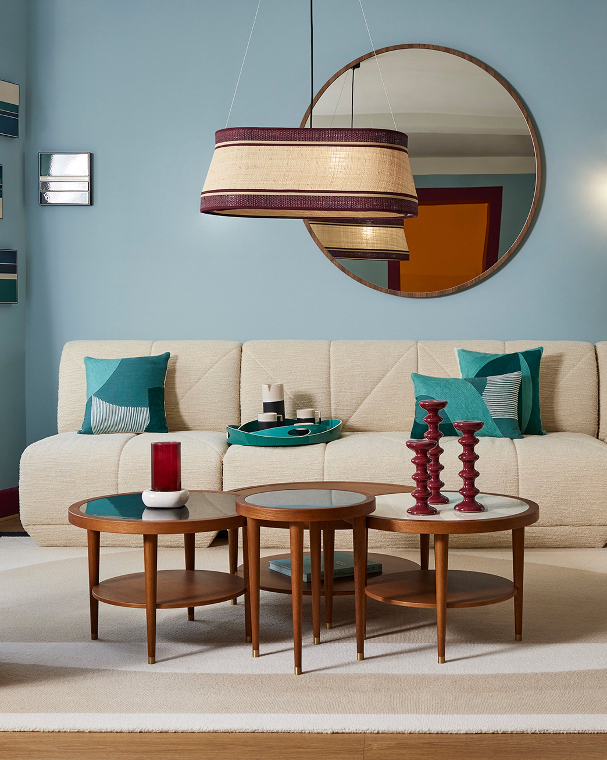 For a thousand pieces. Maison Sarah Lavoine revisits one of its most essential pieces: the Puzzle table. The collection is enriched with a round and low model, inspired by vintage. The solid oak structure is topped with a Bleu Sarah laminate top for a lively touch on the small model, black or ecru on the medium model. As for the large model, it remains raw for a complementary duo or trio.