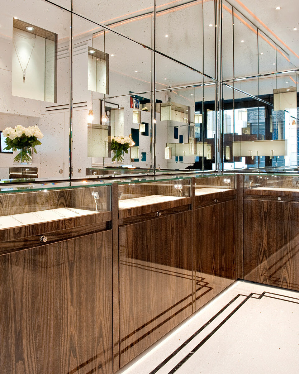 Chaque élément est dessiné sur mesure, les matériaux sont nobles, les bois sont précieux, nous laissant pénétrer dans une véritable boite à bijoux. L’éclairage a été pensé minutieusement de façon à illuminer chaque pièce des collections, spécifiquement.