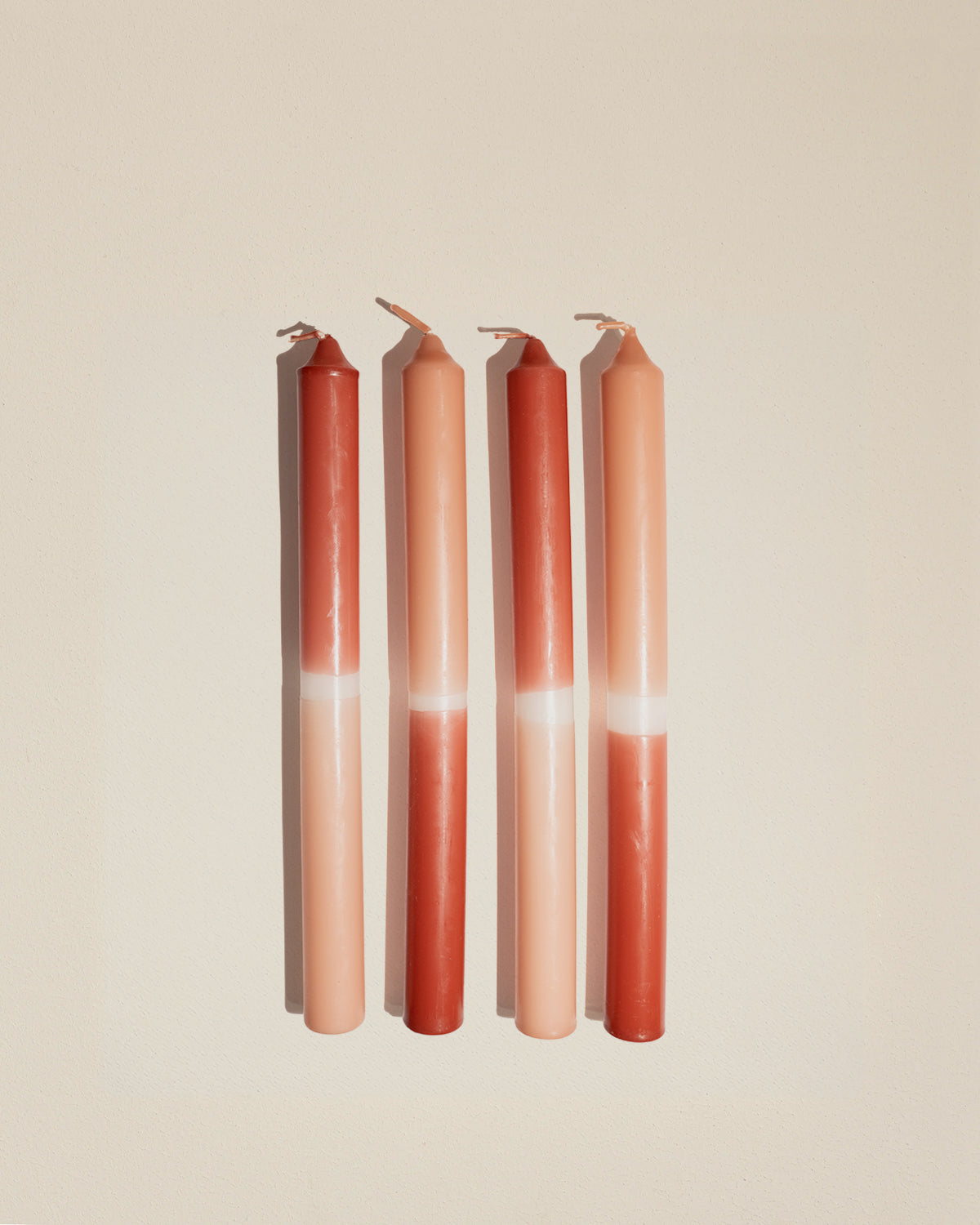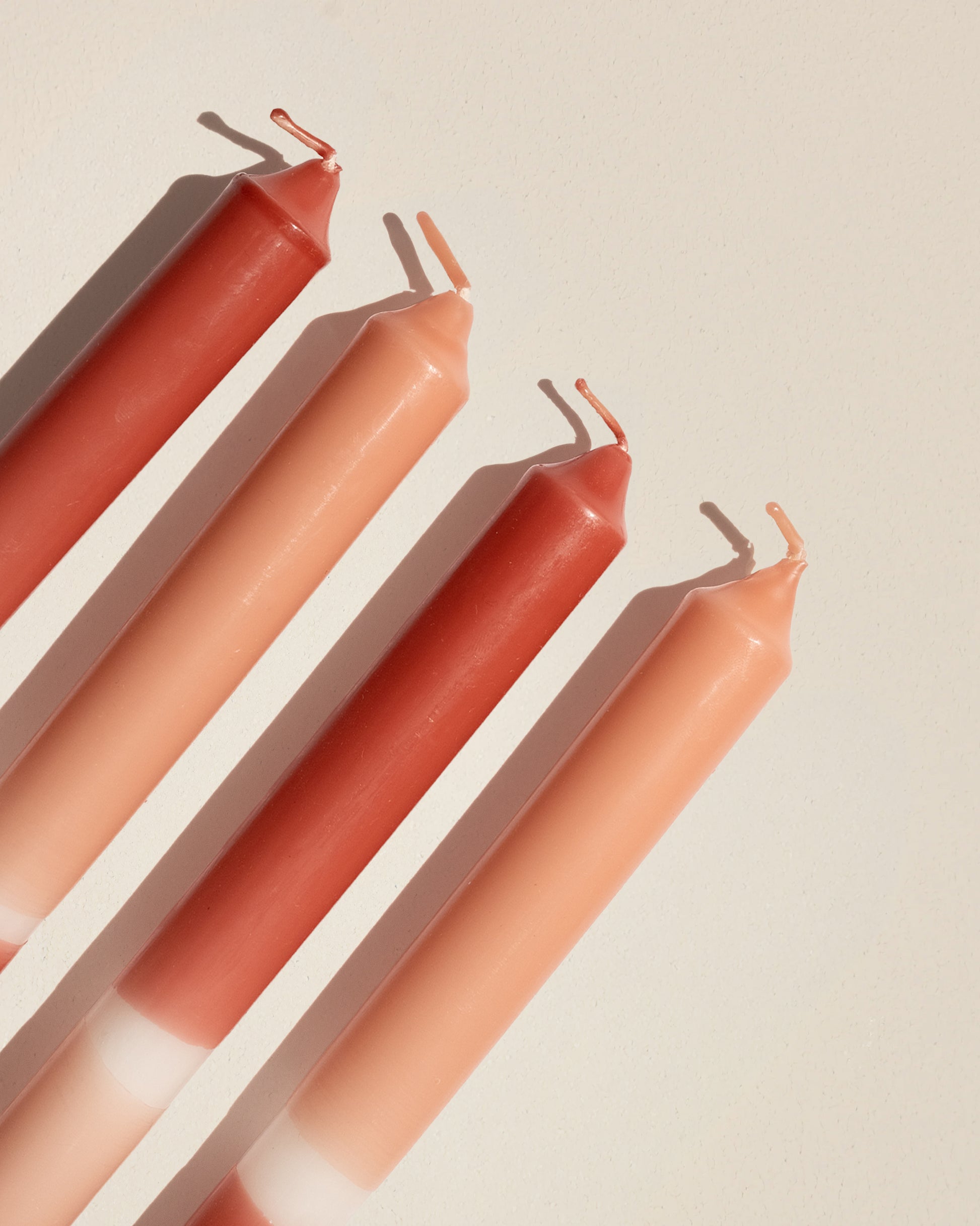 L’effet bicolore naît d’une technique artisanale, dite Dip Dye, qui consiste à plonger la bougie successivement dans différents bains de teintes, révélant ainsi un jeu de couleurs en alternance.