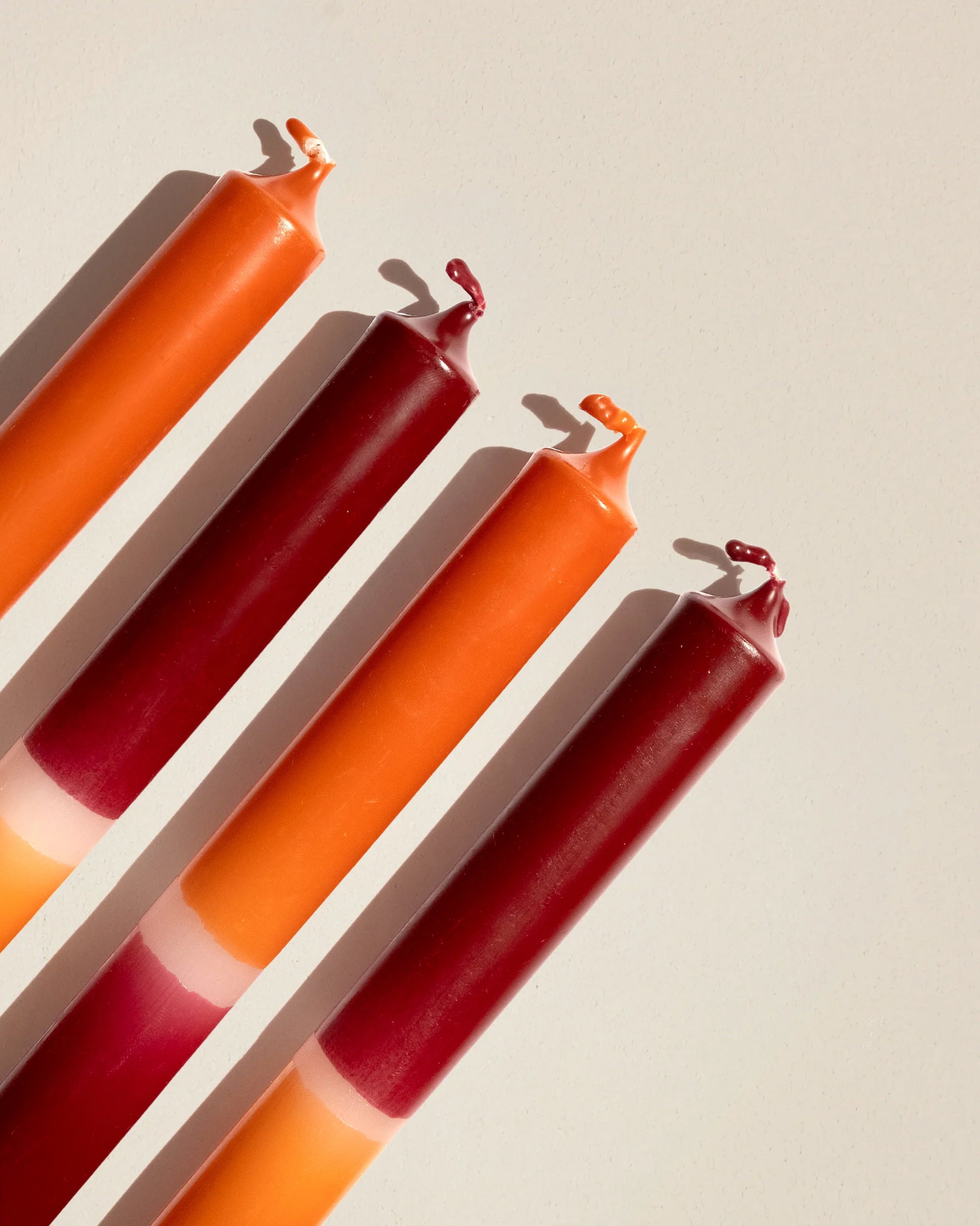 L’effet bicolore naît d’une technique artisanale, dite Dip Dye, qui consiste à plonger la bougie successivement dans différents bains de teintes, révélant ainsi un jeu de couleurs en alternance.