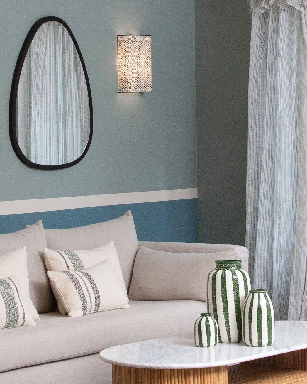 Bleu linéaire. C'est la pièce que l'on aime offrir, regarder ou garnir de ses fleurs de saison préférées. Avec sa forme organique et ses rayures dans des couleurs fortes, le pot Riviera (petit modèle) fusionne l'esprit méditerranéen et l'allure irrégulière d'une véritable pièce d'artisanat.